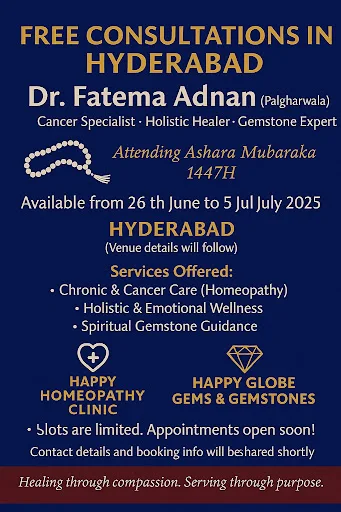 Dr.Fatema Adnan (Palgharwala). Owner - HAPPY HOMEOPATHY CLINIC & HAPPY GLOBE GEMS & GEMSTONES www.happyhomeopathy.com CANCER IS FAST WE ARE FASTER.